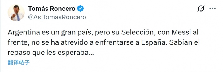 03月15日讯 知名皇马球迷,阿斯报主编龙赛罗发布社媒,对欧美杯取消一事表达了自己的看法。龙赛罗在社媒写道:阿根廷是个伟大的国家,但由梅西领衔的阿根廷国家队,却不敢直面西班牙。他们知道等待他们的将是什么......