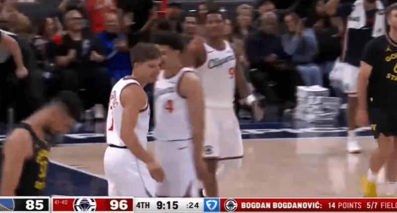 波格丹命中本场第四记三分,快船再次领先勇士到两位数分差。